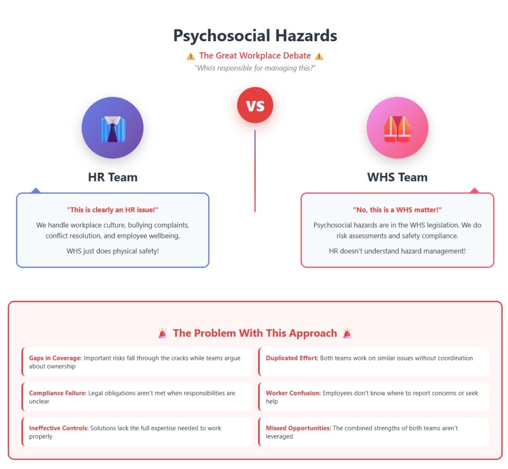 Since the introduction of new psychosocial hazard regulations across Australian jurisdictions, one question keeps coming up: “Who owns this—HR or WHS?”
